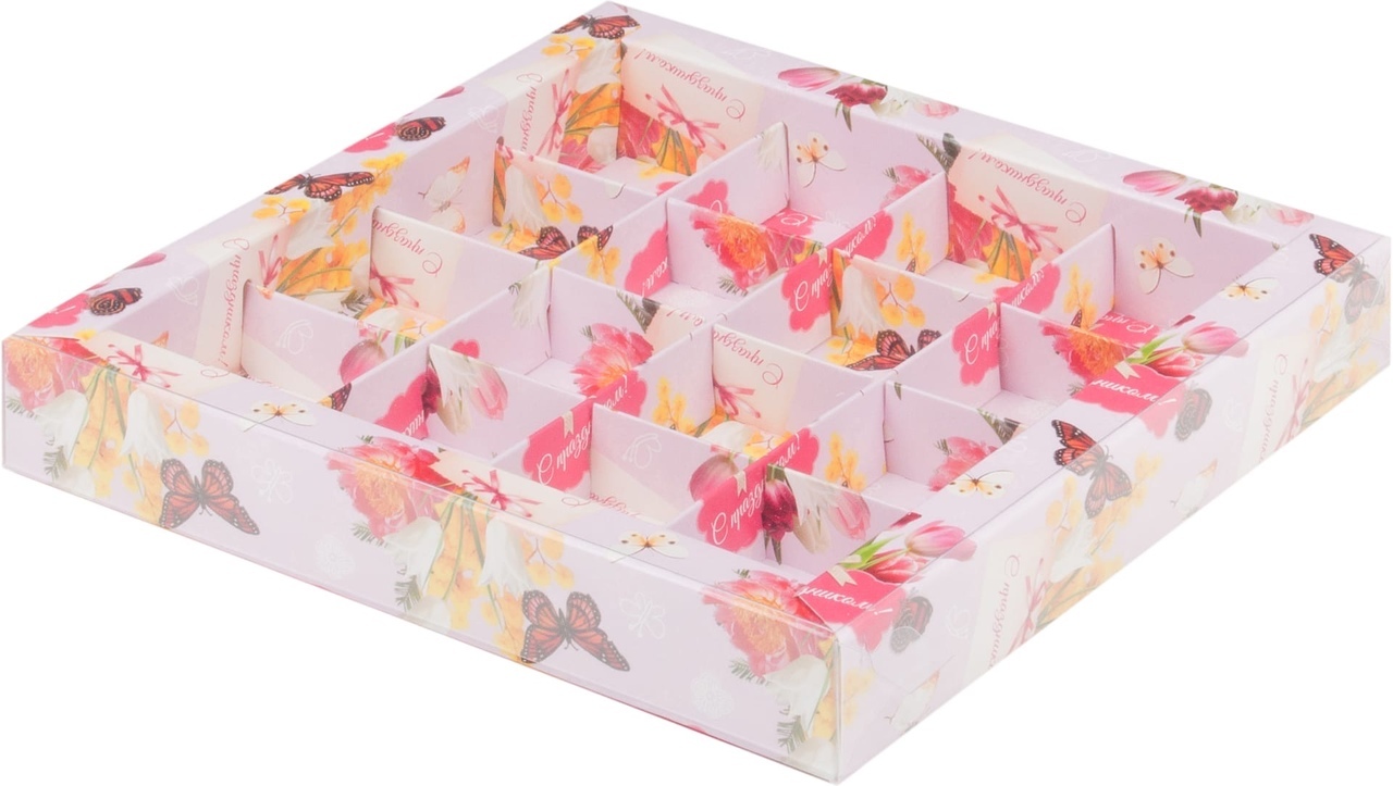 Коробка для 16 конфет с ПВС крышкой (цвет розовая с бабочками)